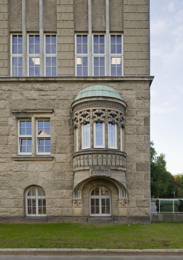 The renovation therefore focused on the roof areas or attics, the basement outer walls and the windows. The natural stone facades were cleaned and repaired. On the west façade, the classroom windows from the 1960s were replaced by heat-protected glazed wooden windows – now with window division according to the original model. Also in the interior restoration special emphasis was placed on restoring the original condition of the corridors, the staircase and the (pre) halls. The wooden stair railings, the floors of Solnhofen slabs, the corridor windows and original fittings – everything was freed of layers of paint, worked up and – where necessary – repaired, so that the elements are restored close to the original state of 1911.