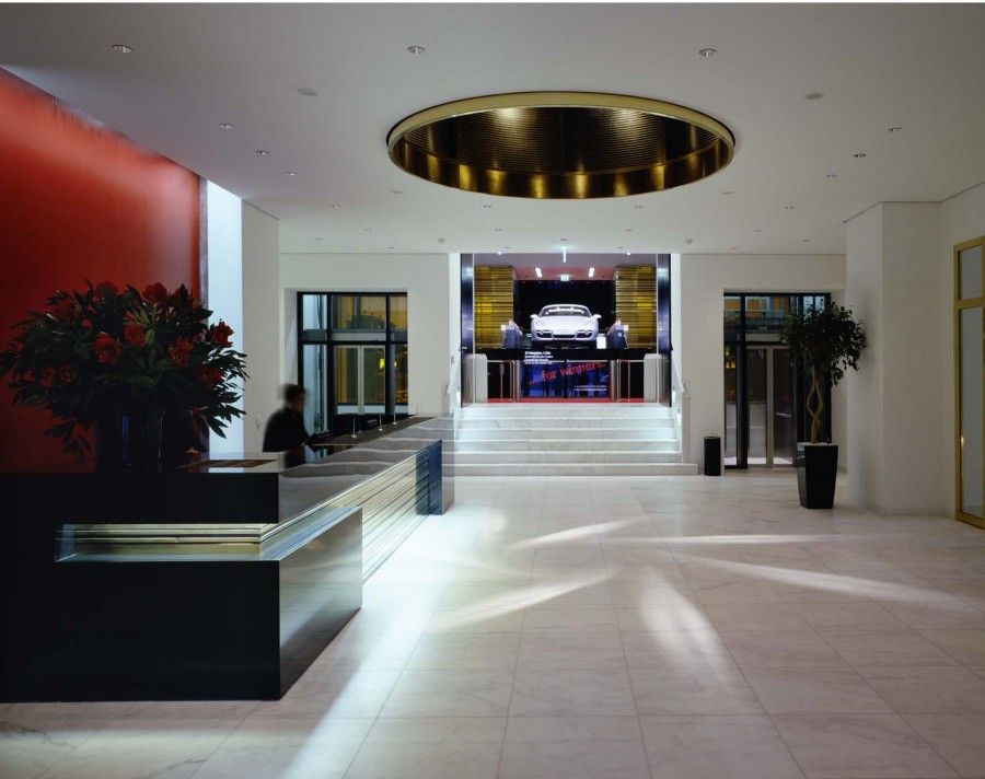 The historical spatial structure with its axiality and the impressive spatial sequences on the ground floor and the central staircase have been restored. In the wall and ceiling claddings of brass slats, glossy or leather-veneered panels, the complex building and safety technology and the lighting has been integrated.