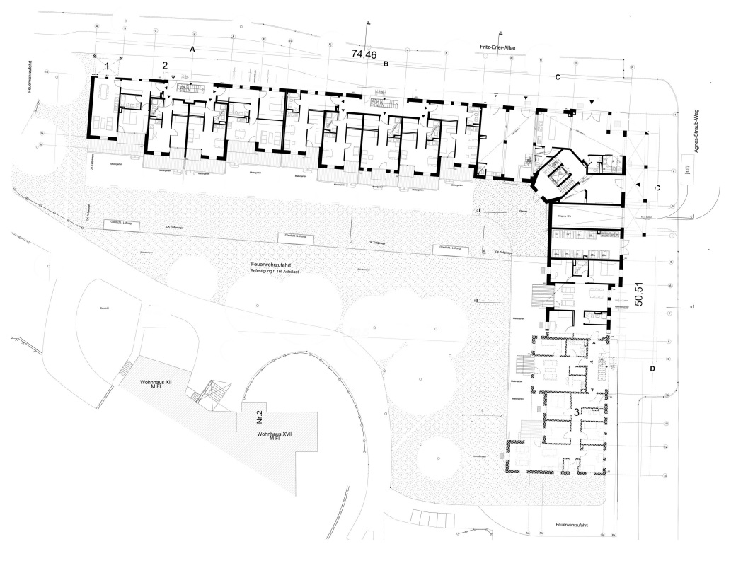 The planned by architect Walter Gropius and named after him large housing estate will be further developed. The new residential construction is planned as a low-rise building (KfW-55-Effizienshaus) with 57 residential units, including 3 residential units of a residential project for stroke patients, 2 commercial units and an underground car park with 41 parking spaces.
