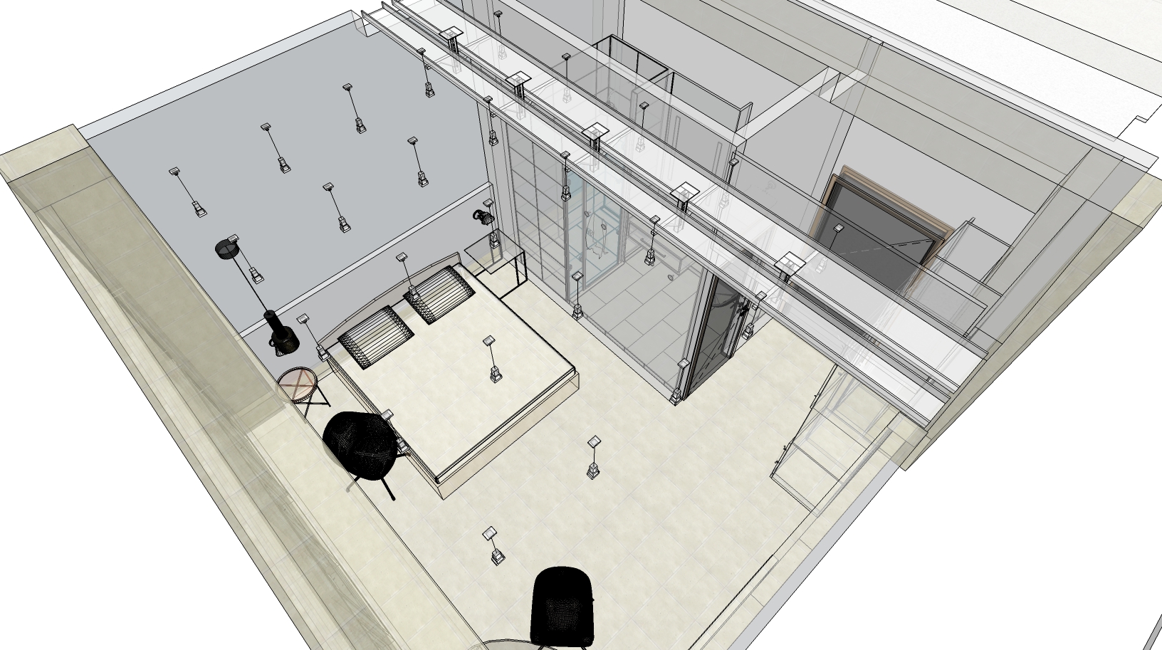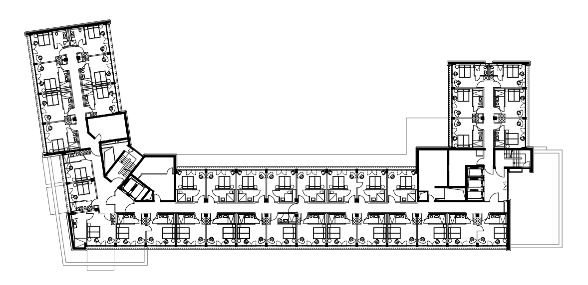 On the ground floor the reception area with reception, bar, conference area, restaurant, as well as a kitchen area and office space for the administration shall be accommodated. The restaurant area is extended by an outdoor terrace with 60 seats in the courtyard.