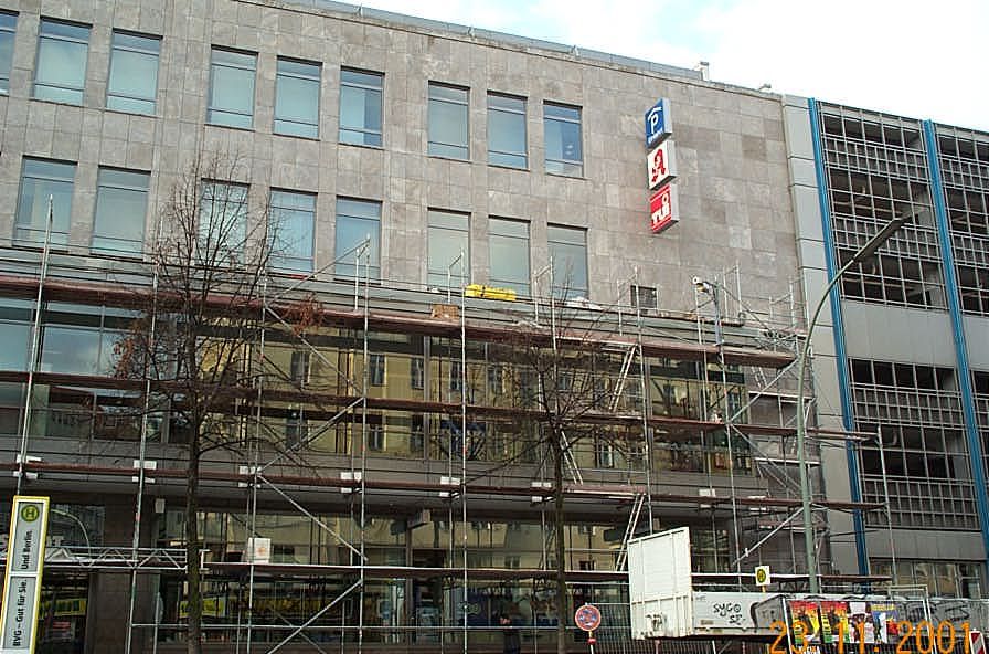 During the war, most of the building was destroyed. A small part of the department store on the street Hasenheide was preserved. The sale started again in late July 1945. Rebuilding began in 1950. The architect Alfred Busse designed a four-storey building, which connected to the preserved part of the building and was built until 1951 at the Hasenheide corner Hermannplatz. Based on this construction, the building was enlarged in the following decades. The last enlargement to date took place in the year 2000 and went hand in hand with a comprehensive revision of the entire appearance. Architects commissioned with the extensions were Helmut Kriegbaum, Jürgen Sawade and Udo Landgraf.