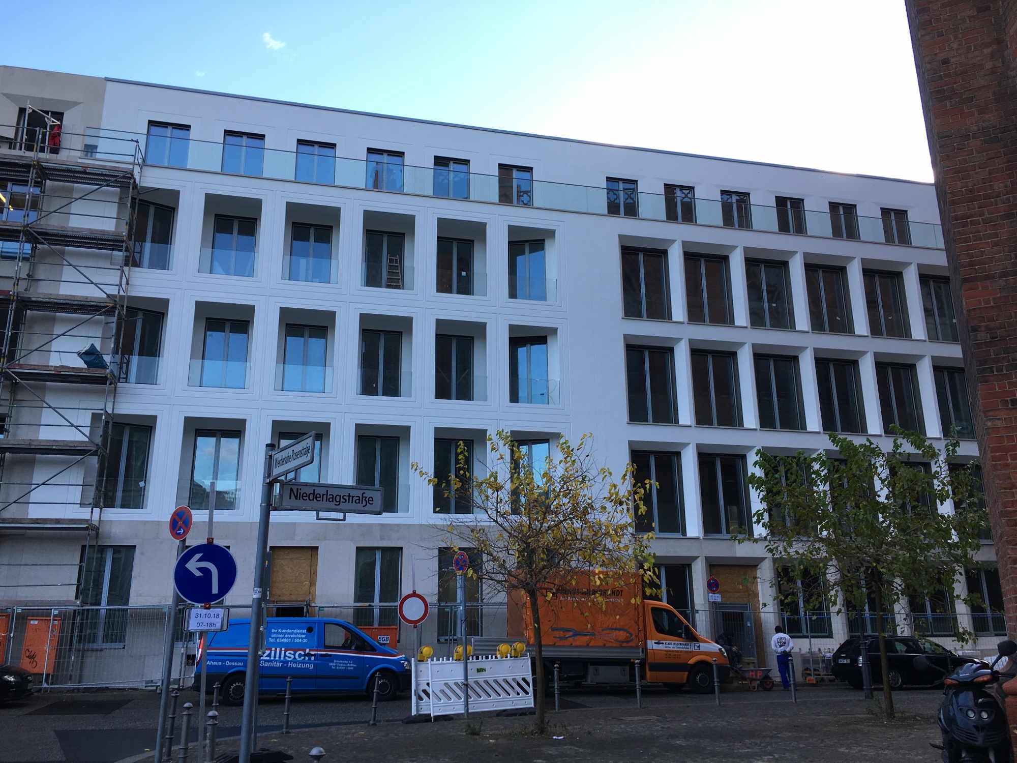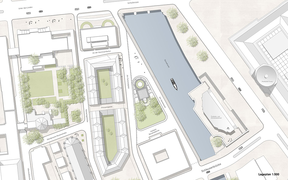 The entire site and the individual buildings are given their own and distinctive image through different designs of house and flat types. The site is located in the centre of the federal capital Berlin and is bordered to the north by Prinzengasse, to the south by Werderscher Markt and the Foreign Office, to the west by Niederlagstraße and to the east by the namesake Schinkelplatz with a view of the City Palace, as well as the Kupfergraben.