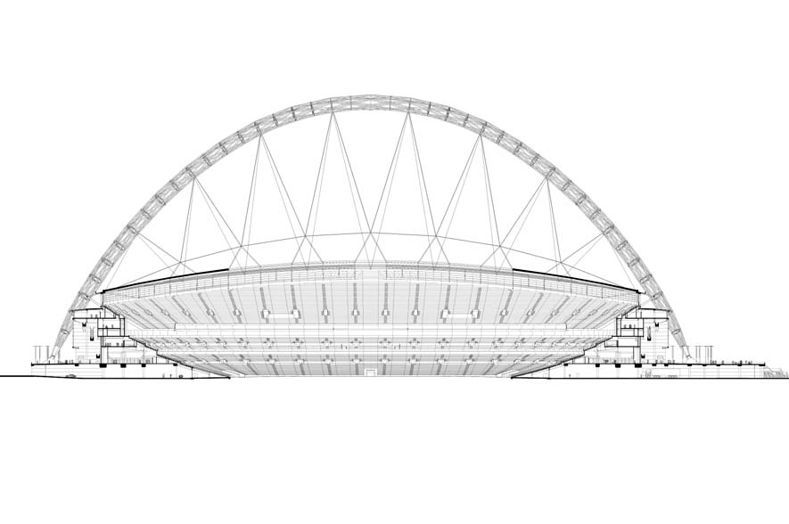 The roof is structurally supported by a spectacular 135-meter high arch towering over the stadium, which is an iconic replacement for the old Twin Towers.